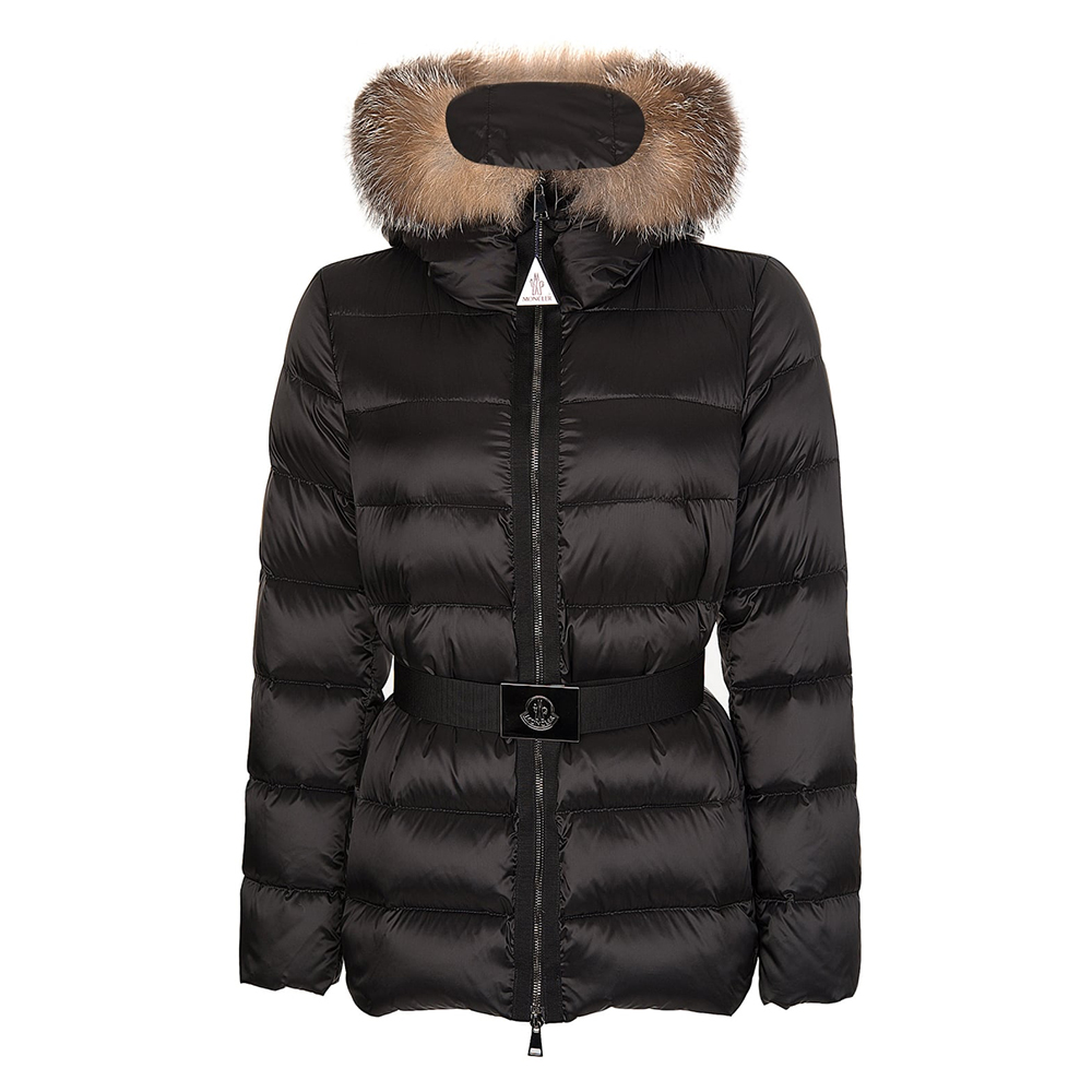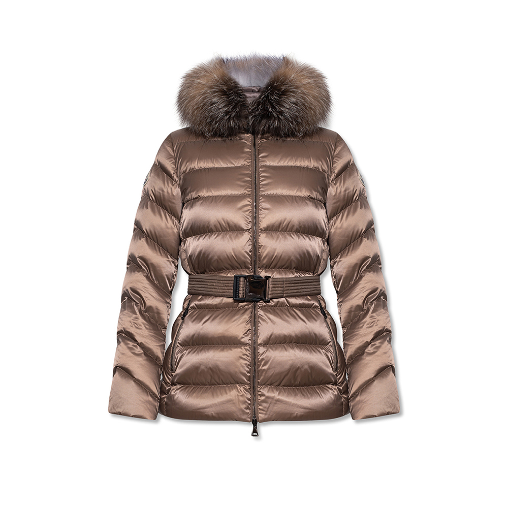 A belt at the waist (often adjustable/detachable) defines the shape and provides a tailored, feminine cut rather than a boxy puffer look.